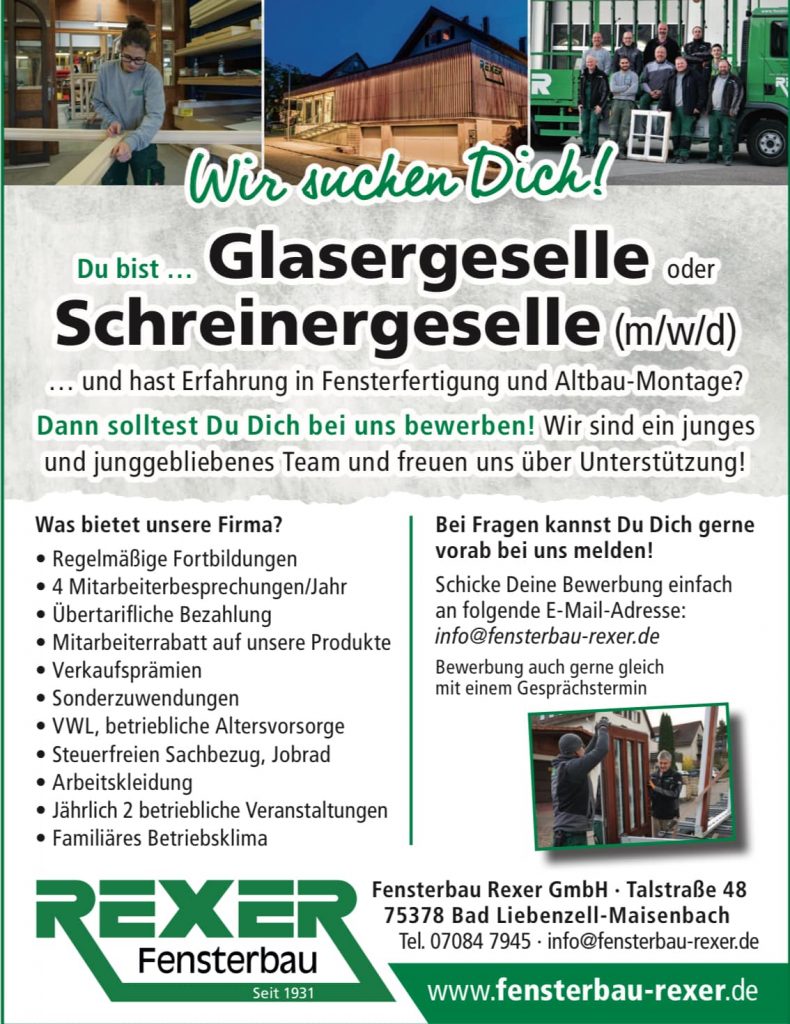 Wir suchen Dich! 🫵🏻 Zur Verstärkung unseres Teams suchen wir einen Glaser- oder Schreinergesellen (m/w/d) mit Erfahrung in Fensterfertigung und Altbau-Montage. Dich erwartet ein junges, motiviertes Team, übertarifliche Bezahlung, Mitarbeiterrabatte sowie ein familiäres Betriebsklima. 👉 Bewirb Dich jetzt: info@fensterbau-rexer.de